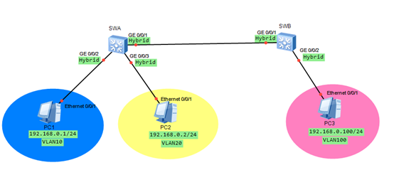 [SWA-GigabitEthernet0/0/1]port hybrid tagged vlan 10 20 100 //配置端口允许通过VLAN 10 20 100