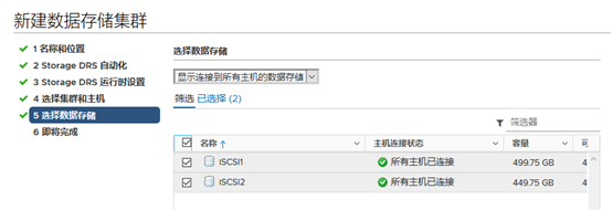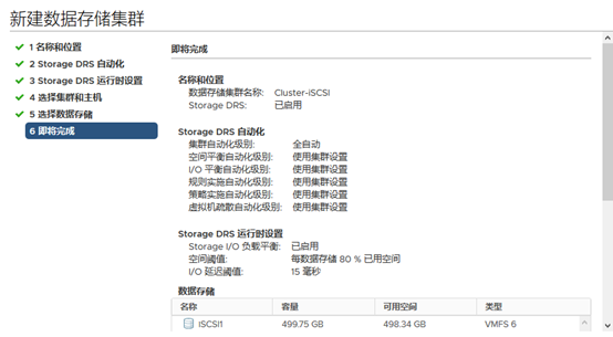 设置存储集群,我们可以把相同性能的存储放在一个存储集群中,然后存储也有drs功能,比如我们的存储有2个iSCSI普通硬盘,然后放一起,存储DRS会根据每个群集的使用空间来自动放置虚拟机,或者可以根据存储的IO来放置虚拟机